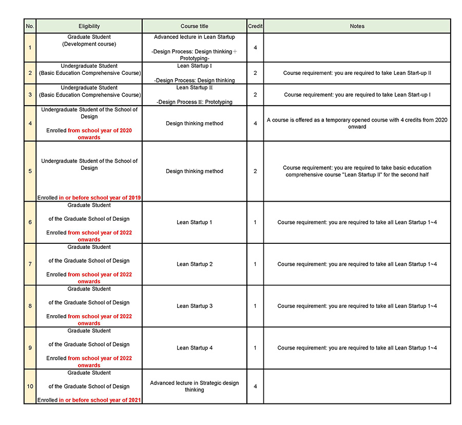 ●Enrolled in the School of Design in and before school year of 2019 ・・・“Design Thinking Method” (2 credits)+”Lean Startup II” (Basic Education Comprehensive Course / 2 credits)