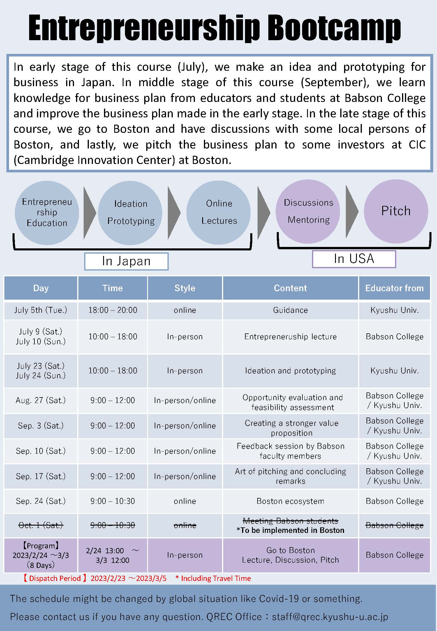 This course is for entrepreneurship education with real field work, going to Boston and pitch your business plan to investors of USA. This course is organized by Kyushu University and Babson College (USA), which is the most popular university for entrepreneurship education.