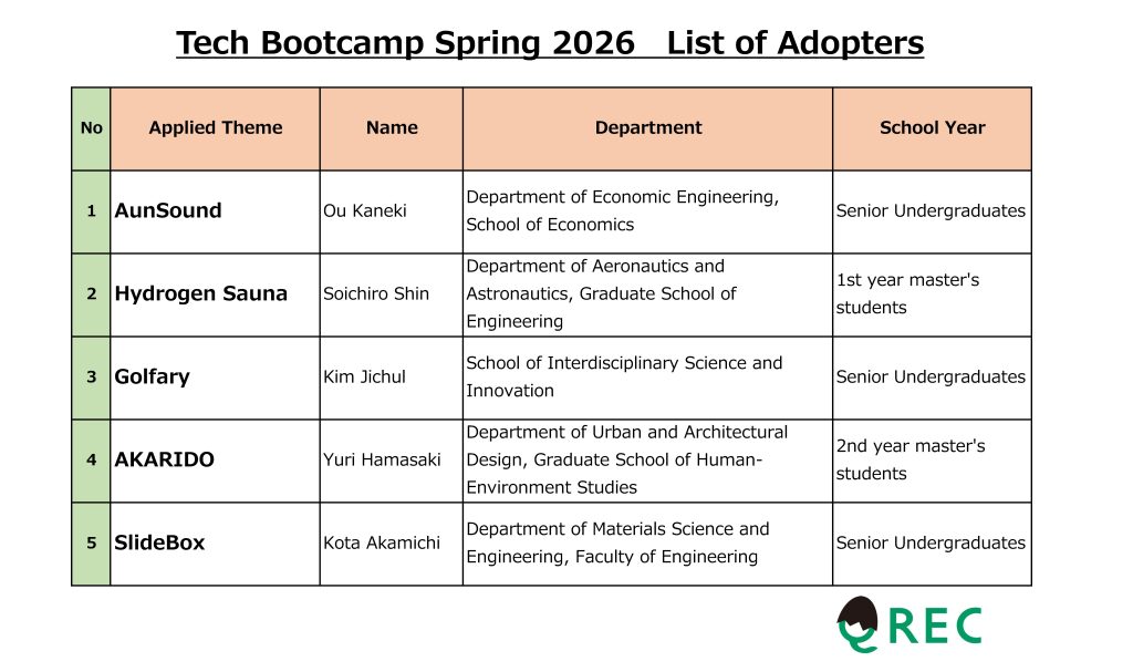 Note that Fukuoka Mitou awardees, Challenge & Creation (C&C), and 100 Program awardees were permitted to apply as exceptions, even if they are undergraduate students, and were selected for this program following the review process.