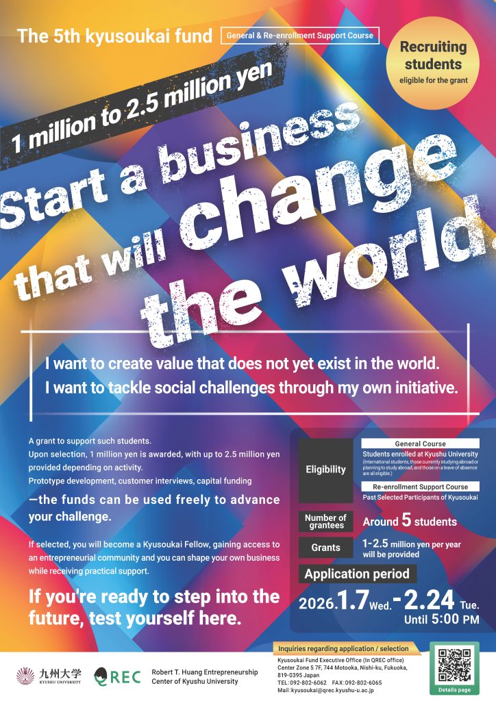 The Kyusoukai Scrape Fund Incentive is looking for Kyushu University students who are aware of the current situation, recognize social issues that need to be solved, and with a constructive and critical spirit, wish to solve social issues with social implementation through business in the future.