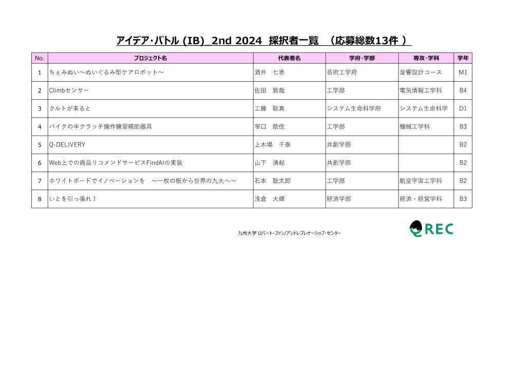 | 採択者説明会 | 2024年5月31日(金)12:05~12:50 [場所:伊都キャンパス センター5号館7階ToP] ■1st採択者一覧 | 2024年10月24日(木)12:10~12:50 [場所:伊都キャンパス センター5号館7階ToP] ■2nd採択者一覧 |