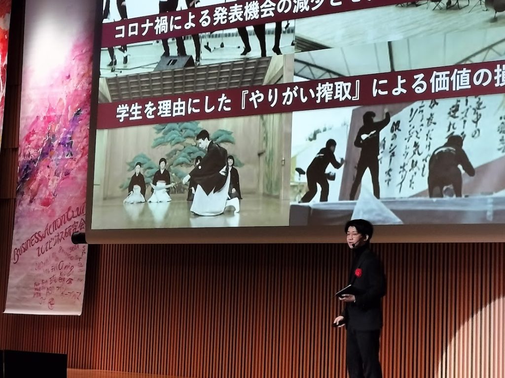 当イベントのビジネス部門において、2024年度チャレンジ&クリエイション(C&C)で優秀賞を受賞、さらには2024年度ジャンプ・アウト・チャレンジ(J.O.C)にて採択された、チーム代表・藤原涼さん(法学部4年)率いる【九大芸能事務所】から、小川竜矢さん(生物資源環境科学府修士2年)が出場されました。